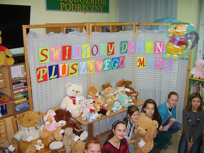 Został on zauważony i doceniony przez dorosłych, którzy dziesięć lat temu pod datą 25 listopada wpisali do kalendarza nowe święto: Światowy Dzień Pluszowego Misia. W tym roku nasza szkoła , ku uciesze młodszych uczniów, włączyła się również w obchody tego święta. Wielka misiowa impreza, zainicjowana przez Grażynę Dymarczyk, rozpoczęła się w tygodniu poprzedzającym święto. Szkolna biblioteka przeżyła prawdziwą inwazję pluszaków przeistaczając się w istną „Misiolandię". Wystawa liczyła 126 przytulanek przyniesionych przez dzieci. Startowły one w najróżniejszych konkurencjach, między innymi: Misia Eleganta, Oryginała, Słodziaka, Cudzoziemca, Śpiocha i były obiektem ogromnego zainteresowania licznie odwiedzających bibliotekę uczniów. Główne uroczystości związane ze świętem przeprowadzone były w poniedziałowy poranek na szkolnym holu, osobno dla dla klas:"0"- I i II-III. Dzieci i misie powitane zostały piosenką „Pokochaj Pluszowego Misiaâ", a następnie z prezentacji multimedialnej dowiedziały się o jego historii sięgającej 1902 roku. Zobaczyły też najsłynniejsze misie, wysłuchały wierszy w wykonaniu uczniów należących do Klubu Bibliofilków oraz wspólnie zaśpiewały piosenkę „Szare misie". Kolejnym punktem programu było wręczenie dyplomów i słodkości właścicielom niezwykłych zabawek oraz laureatom konkursu plastycznego „Mój przyjaciel miś". Fundatorem nagród był dyrektor szkoły Robert Siegel i Rada Rodziców. Imprezę zakończyła parada misiów, które razem z dziećmi w rytm piosenki „Jadą misie, jadą" udały się do swoich klas. Świętowanie Dnia Misia miało na celu popularyzację biblioteki w środowisku szkolnym, rozwijanie zainteresowań czytelniczych oraz integrację społeczności uczniowskiej.