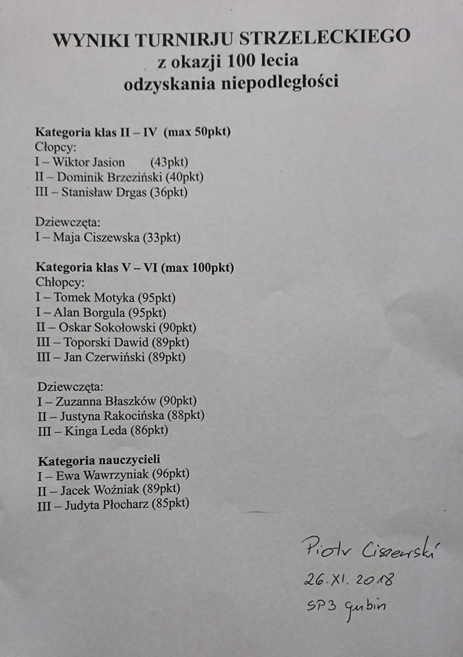 W listopadzie w Szkole Podstawowej nr 3 z Oddziałami Integracyjnymi w Gubinie odbył się Turniej Strzelecki z okazji 100 lecia odzyskania niepodległości. Łącznie wystartowało 35 uczniów oraz 9 nauczycieli. W dniu dzisiejszym odbyło się uroczyste ogłoszenie wyników i wręczenie nagród. Puchar za najlepszy wynik po zaciekłej dogrywce otrzymał Alan Borgula.