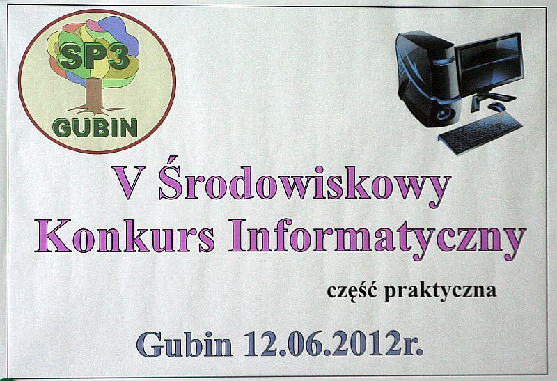 Dwunastego czerwca odbyła się piąta jubileuszowa edycja Środowiskowego Konkursu Informatycznego, organizowanego przez Szkołę Podstawową Nr 3 w Gubinie. Jak w latach poprzednich do zabawy zaproszono wszystkie zaprzyjaźnione szkoły podstawowe z miasta i okolic, między innymi SP1 i SP2 z Gubina oraz szkoły podstawowe z Bieżyc, Grabic i Strzegowa.