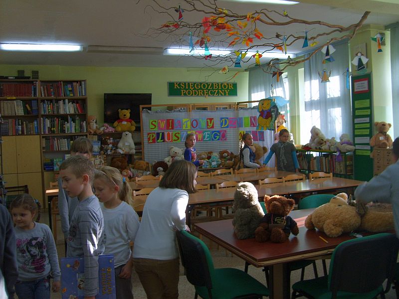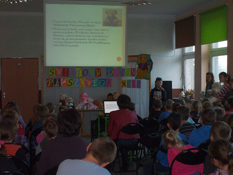 Został on zauważony i doceniony przez dorosłych, którzy dziesięć lat temu pod datą 25 listopada wpisali do kalendarza nowe święto: Światowy Dzień Pluszowego Misia. W tym roku nasza szkoła , ku uciesze młodszych uczniów, włączyła się również w obchody tego święta. Wielka misiowa impreza, zainicjowana przez Grażynę Dymarczyk, rozpoczęła się w tygodniu poprzedzającym święto. Szkolna biblioteka przeżyła prawdziwą inwazję pluszaków przeistaczając się w istną „Misiolandię". Wystawa liczyła 126 przytulanek przyniesionych przez dzieci. Startowły one w najróżniejszych konkurencjach, między innymi: Misia Eleganta, Oryginała, Słodziaka, Cudzoziemca, Śpiocha i były obiektem ogromnego zainteresowania licznie odwiedzających bibliotekę uczniów. Główne uroczystości związane ze świętem przeprowadzone były w poniedziałowy poranek na szkolnym holu, osobno dla dla klas:"0"- I i II-III. Dzieci i misie powitane zostały piosenką „Pokochaj Pluszowego Misiaâ", a następnie z prezentacji multimedialnej dowiedziały się o jego historii sięgającej 1902 roku. Zobaczyły też najsłynniejsze misie, wysłuchały wierszy w wykonaniu uczniów należących do Klubu Bibliofilków oraz wspólnie zaśpiewały piosenkę „Szare misie". Kolejnym punktem programu było wręczenie dyplomów i słodkości właścicielom niezwykłych zabawek oraz laureatom konkursu plastycznego „Mój przyjaciel miś". Fundatorem nagród był dyrektor szkoły Robert Siegel i Rada Rodziców. Imprezę zakończyła parada misiów, które razem z dziećmi w rytm piosenki „Jadą misie, jadą" udały się do swoich klas. Świętowanie Dnia Misia miało na celu popularyzację biblioteki w środowisku szkolnym, rozwijanie zainteresowań czytelniczych oraz integrację społeczności uczniowskiej.
